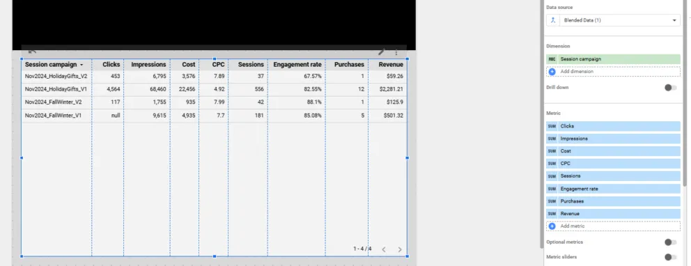 Sure enough, there are formatting errors for those two campaign values in our sheet, meaning Looker Studio can’t match them to the same campaign values in GA4. To fix, adjust the campaign name values in the sheet to match those of GA4 exactly, refresh the data source and reconnect the blend in Looker Studio, and this pulls the missing rows into our blend.