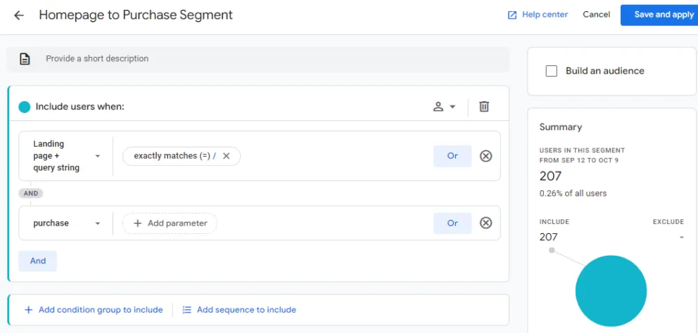 Google also provides templates that steer your segment creation with pre-filled conditions, as well as predictive segments, based on users who are likely to complete specific actions in a given timeframe.
