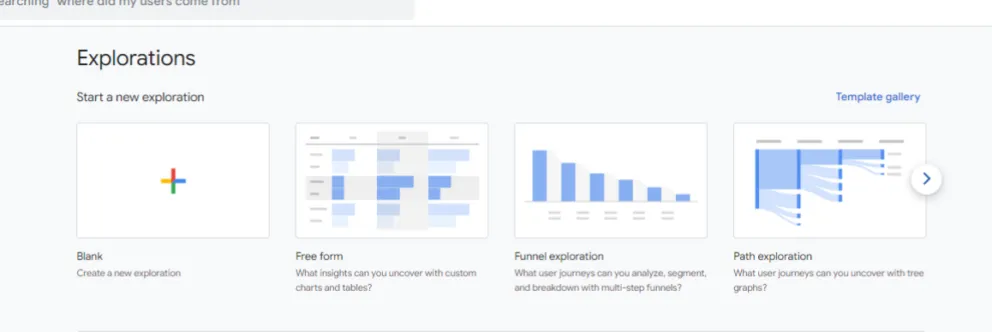 Once in, you’ll be presented with a selection of report templates, alongside a list of any explorations created within your GA4 property prior.